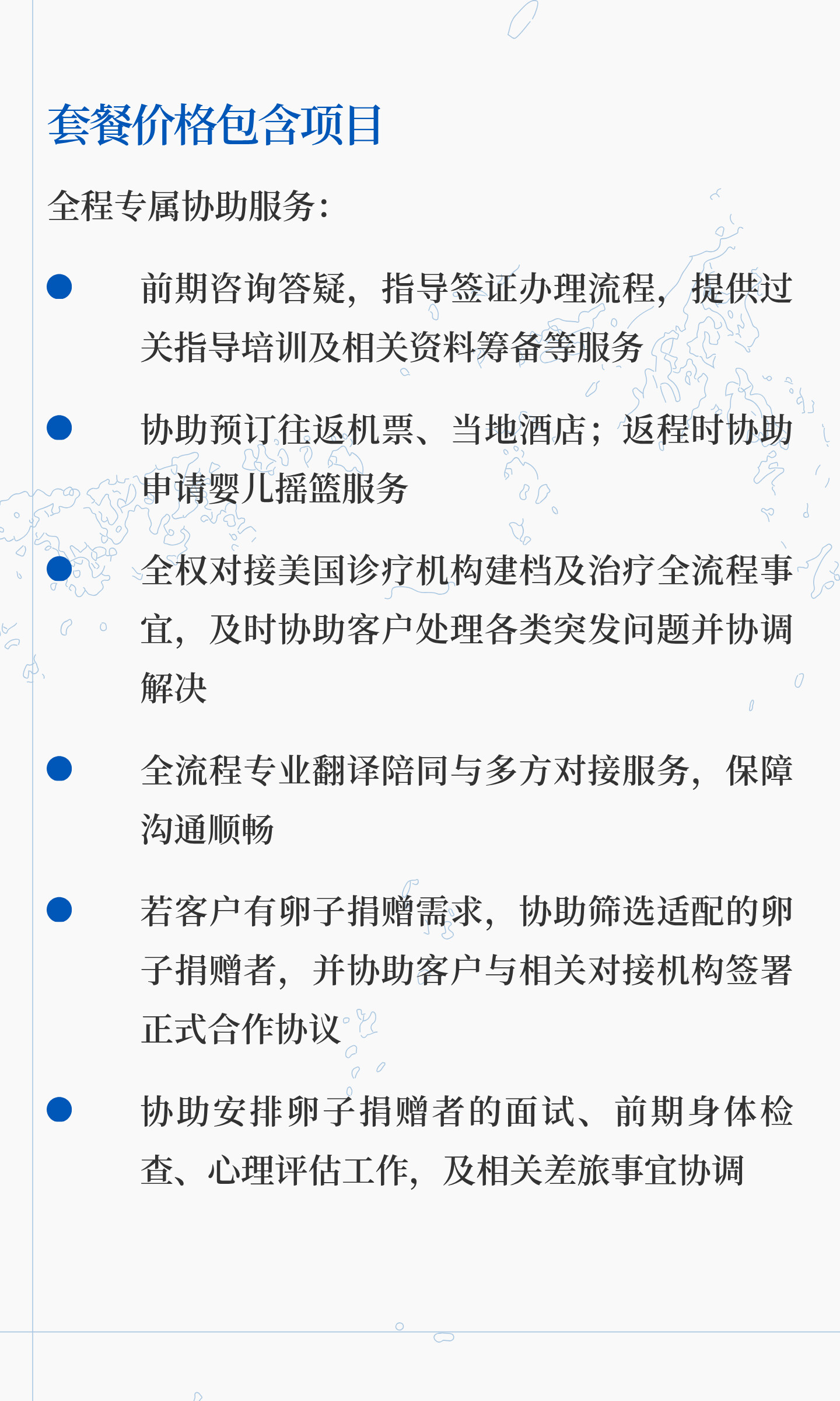 纯辅助生殖配套服务套餐(价格更具优势)¥138000套餐价格包含项目全程专属协助服务:前期咨询答疑,指导签证办理流程,提供过关指导培训及相关资料筹备等服务协助预