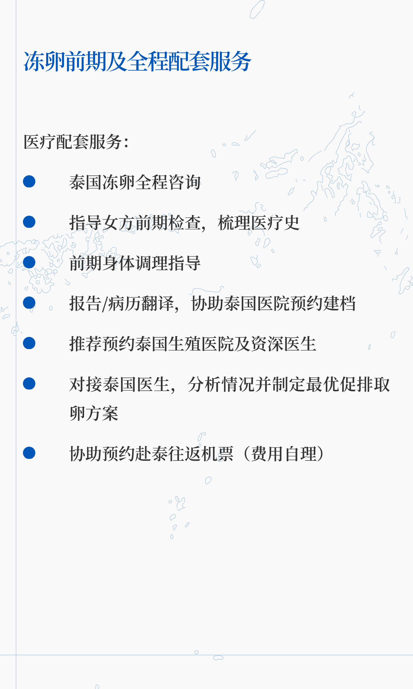 泰国冻卵纯服务套餐¥4000冻卵前期及全程配套服务医疗配套服务:泰国冻卵全程咨询指导女方前期检查,梳理医疗史前期身体调理指导报告/病历翻译,协助泰国医院预约建档